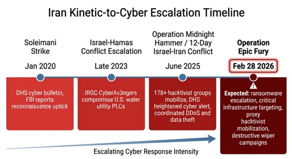 The pattern is well documented. After the U.S. killing of IRGC General Qasem Soleimani in January 2020, DHS issued an immediate bulletin warning that Iran could execute cyberattacks against U.S. critical infrastructure with little or no warning [1]. The FBI observed a measurable uptick in Iranian cyber reconnaissance activity within days [2]. When the Israel-Hamas conflict escalated in late 2023, IRGC-affiliated actors compromised Israeli-made programmable logic controllers and human-machine interfaces deployed at dozens of U.S. water and wastewater facilities [3]. During last June’s twelve-day Israel-Iran conflict and Operation Midnight Hammer, DHS again warned of heightened cyber risk [4][5], and analysis of over 250,000 Telegram messages from more than 178 hacktivist and proxy groups revealed coordinated, rapid mobilization of Iranian-backed cyber campaigns timed to military operations [6][7].