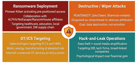 This matters enormously in the current context. Iranian state-sponsored groups have historically operated on two tracks simultaneously: intelligence collection in support of the regime’s geopolitical interests, and financially motivated operations that fund their activities and inflict economic damage. When kinetic conflict escalates, the incentive structure shifts. Operations that were previously conducted opportunistically can be directed strategically. Network access that was being quietly maintained for future ransomware deployment can be activated on command.